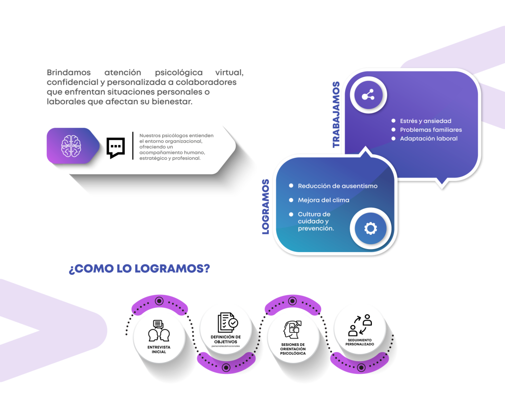 Asesoría y Consejería Psicológica Virtual Asesoría y Consejería Psicológica Virtual Formulario de contacto Please enable JavaScript in your browser to complete this form.Name *Empresa Cargo interés Name Cargo Email corporativo *Servicio de interés *Servicios de interésCoaching personal y ejecutivoCapacitación y programas de formaciónReclutamiento y selección de líderesThird ChoiceAsesoría psicológica virtualProgramas de formación de líderesDesarrollo organizacionalAuditorías laborales, de seguridad y salud ocupacionalOtrosMensajeAcepto el tratamiento de mis datos personales conforme a la Política de Privacidad .Enviar ¿Qué hacemos? Conectamos personas y resultados. Con enfoque humano, práctico y orientado al éxito de tu organización. Contáctanos Fortalece a tus líderes y transforma tu organización. Agenda tu diagnóstico inicial. Nuestra MisiónAportar, desde nuestra experiencia y humanidad, al desarrollo de las personas y las organizaciones siempre centrados en resultados. Nuestra VisiónSer reconocidos como aliados estratégicos en el desarrollo humano y organizacional en Latinoamérica, generando impacto positivo, medible y duradero. Nuestra misión y visión en concordancia con lo que hacemos. Contáctanos Nombre Email Servicio de interés Coaching personal y ejecutivo Capacitación y programas de formación Consultoría en gestión de recursos humanos Reclutamiento y selección de líderes Asesoría psicológica virtual Programas de formación de líderes Desarrollo organizacional Auditorías laborales, de seguridad y salud ocupacional Mensaje Enviar